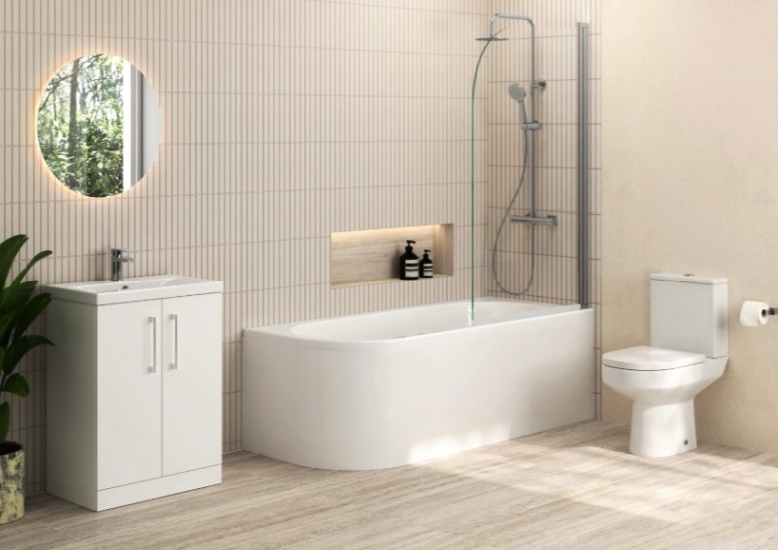 Erin Modern Shower Bath Suite with 1700mm J Shaped Bath & Rimless Toilet